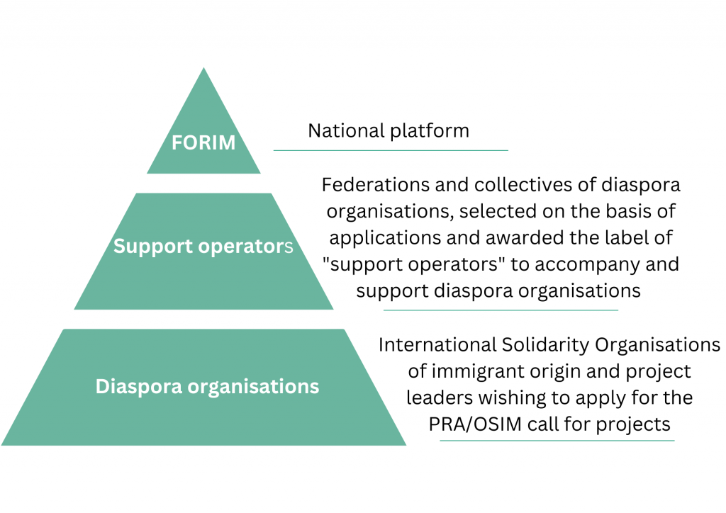 Established in France in 2002, FORIM manages a unique structure whereby diaspora networks support diaspora organisations by accompanying project design and implementation in countries of origin, promoting cascade learning and peer exchanges. With the support of diaspora networks (or FORIM’s accredited support operators), individual diaspora organisations in France can apply for financing for micro-projects to be carried out in the countries of origin through FORIM’s PRA/OSIM programme (Programme d’Appui aux projets des Organisations de Solidarité Internationale issues de l’Immigration).